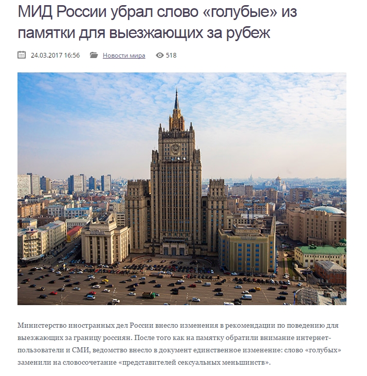Es cierto que el Ministerio de los Asuntos Exteriores de Rusia (МИД) ha decidido realizar unos cambios en la guía para los turistas rusos que viajan al extranjero y que la palabra “golubói” (голубой) ha sido sustituida en ella por “representantes de minorías sesxuales” (представители сексуальных меньшинств). Pero ¿y por qué?